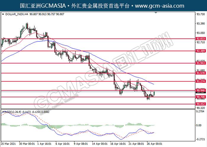 20210427 DOLLAR_INDX-午间 by willy | Apr 27, 2021 | 美元指数 | 0 comments GCMAsia-DOLLAR_INDX DOLLAR_INDX 2021-04-27 DOLLAR_INDX,H4:美元低位反弹。MACD空头动能略减,短期可关注多头为主。上方关90.95压力和91.25压力,下方关注90.70支撑和90.45支撑。