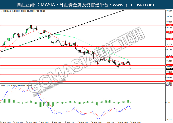 DOLLAR_INDX,H4:美指下破前期支撑,震荡下行。MACD已形成死叉,动能转弱,短期可关注空头为主。上方关90.75压力和91.25压力,下方关注90.15支撑和89.65支撑。