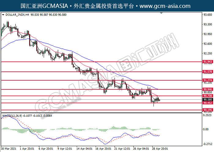 DOLLAR_INDX,H4:美元高位承压后回落,目前测试着支撑位。然而,MACD空头动能略减,短期可关注技术性反弹为主。上方关90.70压力和90.95压力,下方关注90.45支撑和90.20支撑。