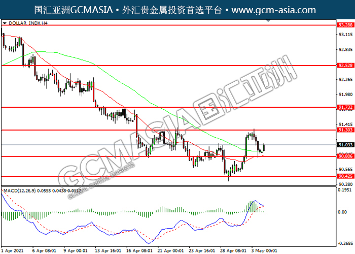 DOLLAR_INDX,H4:美指震荡下行,目前测试前期支撑。MACD多头动能略减,若突破可关注空头为主。上方关91.30压力和91.70压力,下方关注90.80支撑和90.45支撑。
