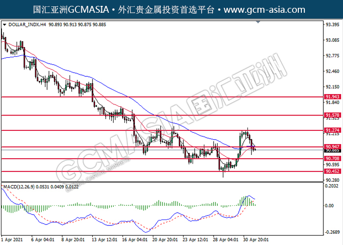 20210504 DOLLAR_INDX by willy | May 4, 2021 | 美元指数 | 0 comments GCMAsia-DOLLAR_INDX DOLLAR_INDX 2021-05-04 DOLLAR_INDX,H4:美元突破后持续下行。MACD多头动能略减,短期可关注空头为主。上方关90.95压力和91.25压力,下方关注90.70支撑和90.45支撑。