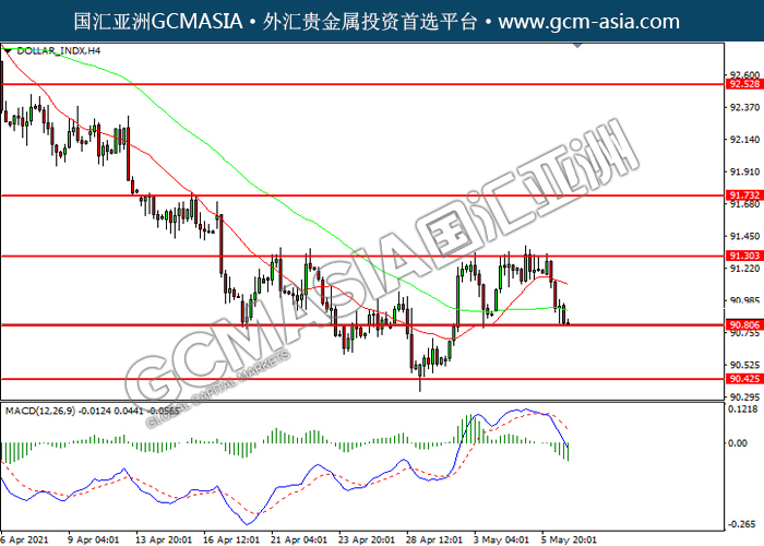 DOLLAR_INDX,H4:美指震荡下行,目前测试前期支撑。MACD空头动能略增,若下破可关注空头为主。上方关91.30压力和91.75压力,下方关注90.80支撑和90.45支撑。