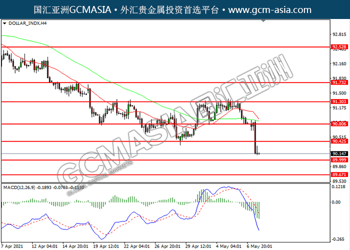 DOLLAR_INDX,H4:美指震荡下行,目前测试前期支撑。MACD空头动能略增,若下破可关注空头为主。上方关90.45压力和90.80压力,下方关注90.00支撑和89.65支撑。