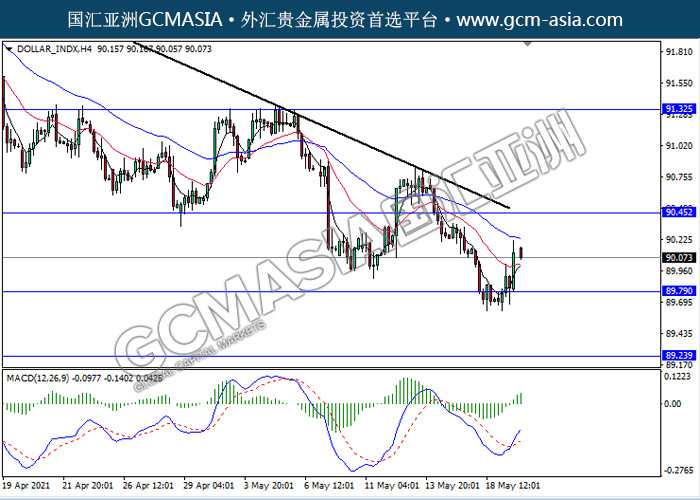 DOLLAR_INDX,H4:美元突触底反弹上行。MACD形成金叉,动能略增,短期继续看多为主。上方关90.45压力和91.30压力,下方关注89.80支撑和8925支撑。