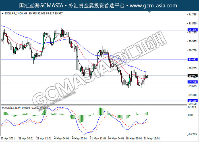 DOLLAR_INDX,H4:美元突破前期压力,低位反弹。MACD动能略增,短期继续看多方向为主。上方关90.45压力和91.30压力,下方关注89.80支撑和89.25支撑。