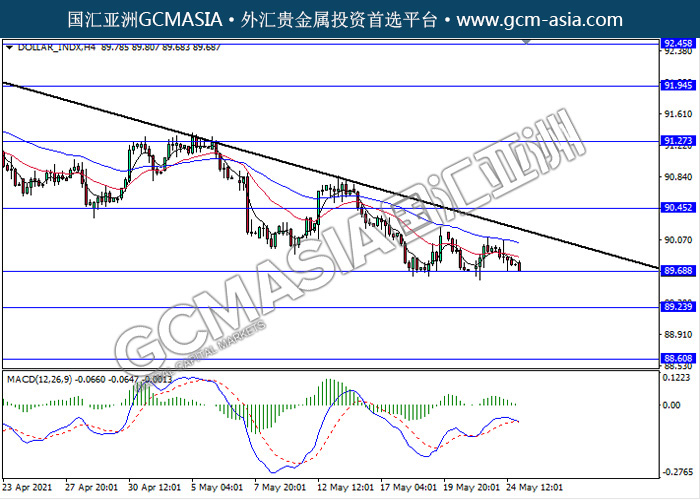 DOLLAR_INDX,H4:美元震荡下行,目前测试前期支撑。MACD形成死叉,多头动能略减,若突破继续看空为主。上方关90.45压力和91.30压力,下方关注89.70支撑和89.25支撑。