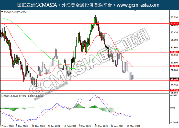 DOLLAR_INDX,Daily:美指震荡下行,目前靠近前期支撑。然而,MACD空头动能略减,短期可关注技术性回调为主。上方关90.50压力和91.30压力,下方关注89.65支撑和89.10支撑。