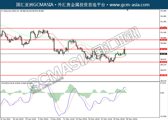 20210531 DOLLAR_INDX by willy | May 30, 2021 | 美元指数 | 0 comments GCMAsia-DOLLAR_INDX DOLLAR_INDX 2021-05-31 DOLLAR_INDX,H4:美指高位回落。MACD多头动能略减,若突破可关注空头为主。上方关90.25压力和90.75压力,下方关注89.50支撑和88.80支撑。