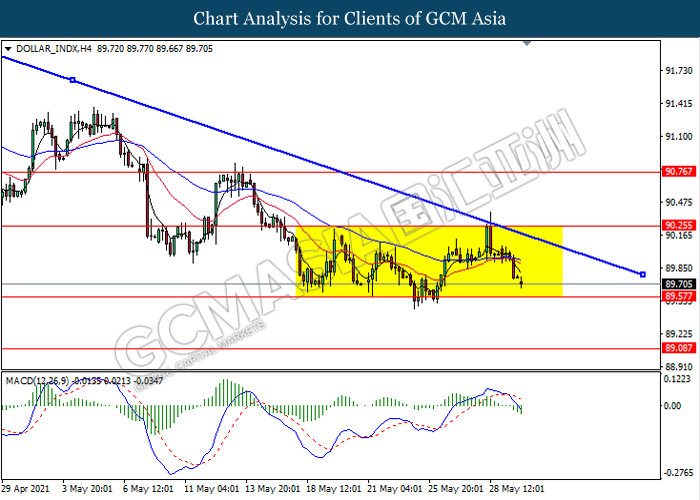 DOLLAR_INDX,H4:美指仍区间震荡交易,目前测试靠近前期支撑。然而,MACD形成死叉,动能略减,若突破可关注空头方向为主。上方关90.25压力和90.75压力,下方关注89.55支撑和89.10支撑。