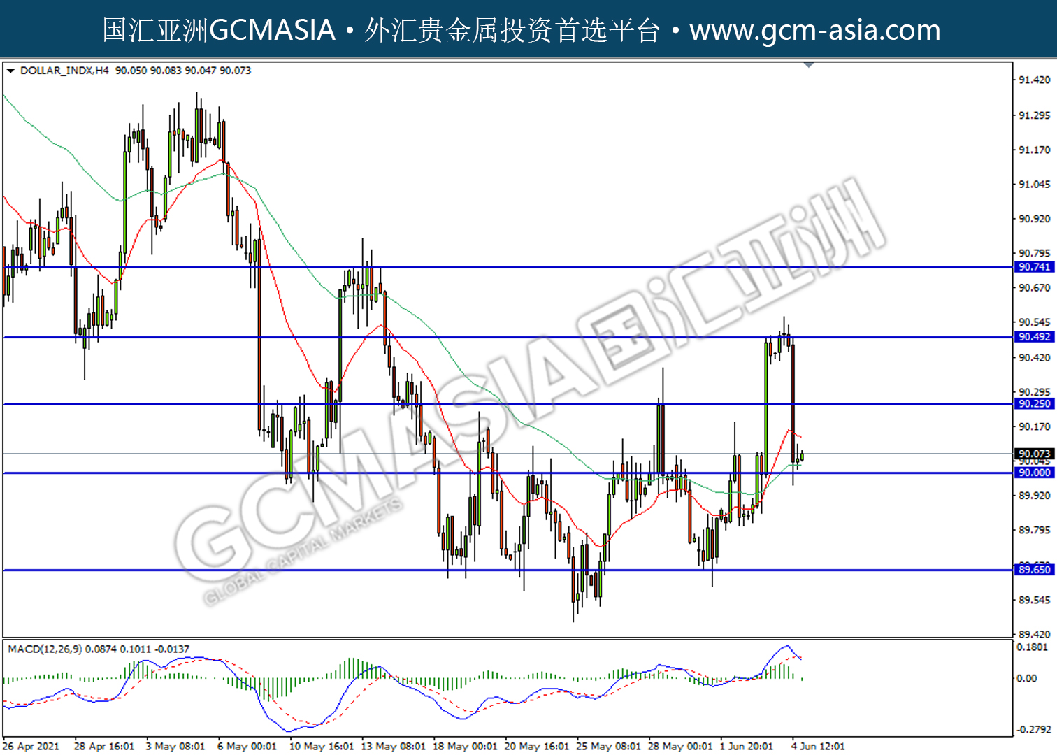 20210607-DOLLARINDX by willy | Jun 7, 2021 | 美元指数 | 0 comments DOLLAR_INDX,H4:美指震荡下行,目前测试前期支撑。MACD空头动能略增,若下破可关注空头为主。上方关90.25压力和90.50压力,下方关注90.00支撑和89.65支撑。