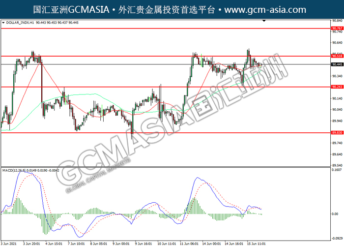 20210616 DOLLAR_INDX by willy | Jun 16, 2021 | 美元指数 | 0 comments DOLLAR_INDX,H1:美指高位回落。MACD空头动能略增,短期可关注空头。上方关90.50压力和90.75压力,下方关注90.25支撑和89.85支撑。