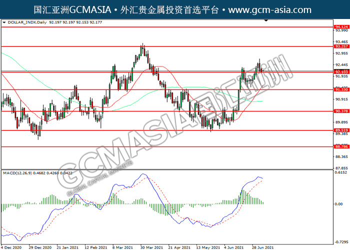20210706 DOLLAR_INDX by willy | Jul 6, 2021 | 美元指数 | 0 comments DOLLAR_INDX,Daily:美指震荡下行,目前测试前期支撑。MACD多头动能略减,若下破可关注空头为主。上方关93.25压力和94.10压力,下方关注92.10支撑和91.30支撑。
