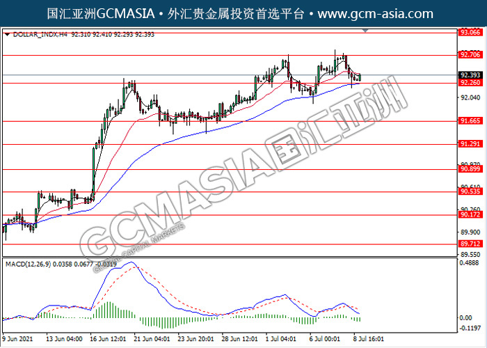 20210709 DOLLAR_INDX-午间 by keyk | Jul 9, 2021 | 美元指数 | 0 comments DOLLAR_INDX,H4:美指近期高位承压回落,目前测试靠近前期支撑。MACD动能略减,若突破可继续看空为主。上方关92.70压力和93.05压力,下方关注92.25支撑和91.65支撑。