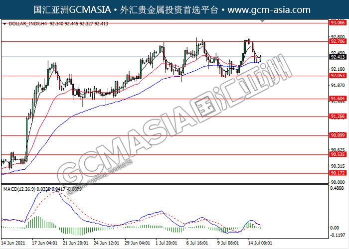 20210715 DOLLAR_INDX-午间 by keyk | Jul 15, 2021 | 美元指数 | 0 comments DOLLAR_INDX,H4:美指近期高位承压回落。MACD形成死叉,动能略减,短期可继续看空回调为主。上方关92.70压力和93.05压力,下方关注92.05支撑和91.60支撑。