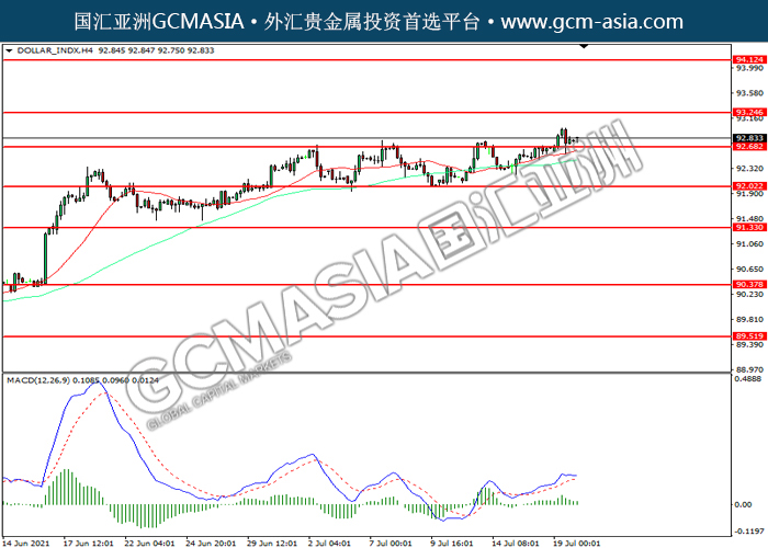 20210720 DOLLAR_INDX-午间 by willy | Jul 20, 2021 | 美元指数 | 0 comments DOLLAR_INDX,H4:美指震荡下行,目前测试前期支撑。MACD多头动能略减,若下破可关注空头为主。上方关93.25力和94.10压力,下方关注92.70支撑和92.00支撑。