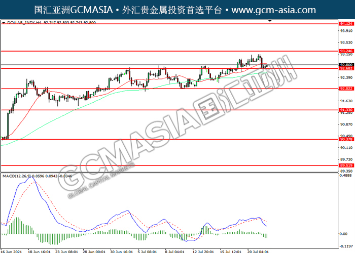 20210722 DOLLAR_INDX by willy | Jul 22, 2021 | 美元指数 | 0 comments DOLLAR_INDX,H4:美指震荡下行。MACD空头动能略减,若下破可关注空头为主。上方关93.25力和94.10压力,下方关注92.70支撑和92.00支撑。