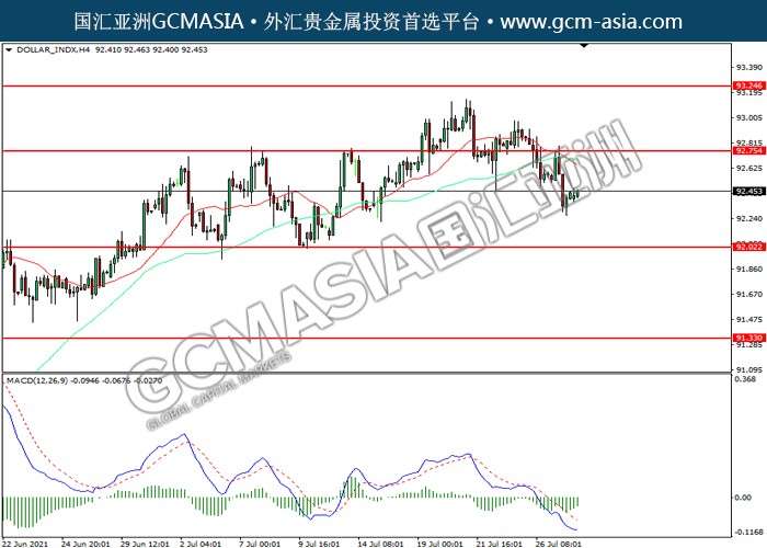 DOLLAR_INDX,H4:美指震荡下行。然而,MACD空头动能略减,短期可关注技术性回调为主。上方关92.75力和93.25压力,下方关注92.00支撑和91.35支撑。