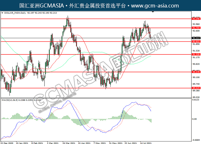 20210729 DOLLAR_INDX by willy | Jul 29, 2021 | 美元指数 | 0 comments DOLLAR_INDX,Daily:美指震荡下行。MACD空头动能略增,短期可关注空头为主。上方关92.75力和93.25压力,下方关注92.00支撑和91.35支撑。