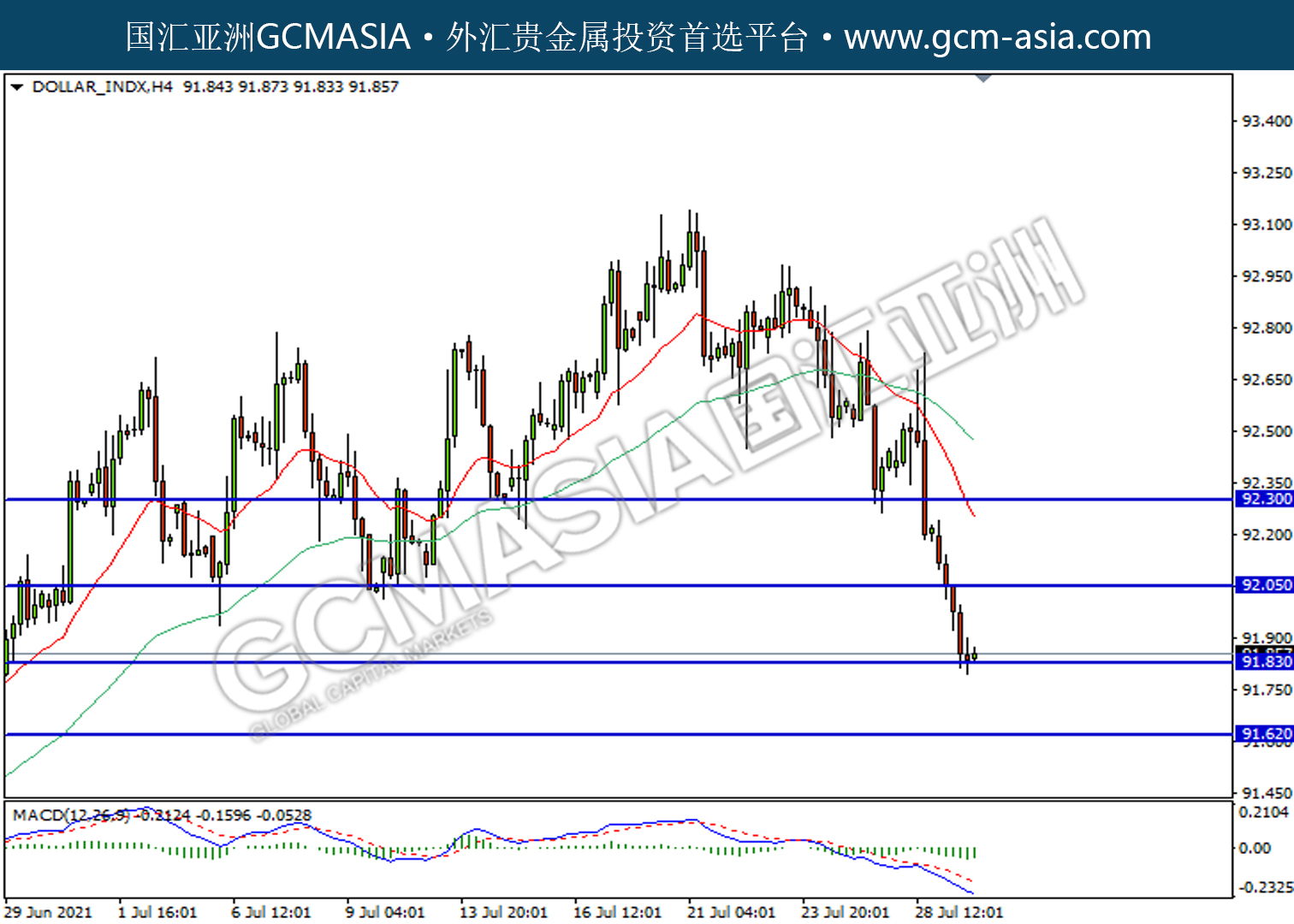 20210730-DOLLARINDX by willy | Jul 30, 2021 | 美元指数 | 0 comments DOLLAR_INDX,H4:美指空头排列。MACD已形成死叉,动能转弱,若下破可继续看空。上方关92.05压力和92.30压力,下方关注91.85支撑和91.60支撑。
