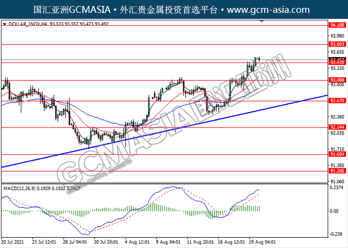 20210820 DOLLAR_INDX-午间 by keyk | Aug 20, 2021 | 美元指数 | 0 comments DOLLAR_INDX,H4:美指突破前期压力,多头排列。MACD动能持续略增,短期继续看多为主。上方关93.80压力和94.20压力,下方关注93.45支撑和93.10支撑。