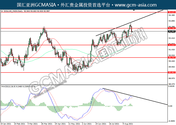 20210824 DOLAR_INDX by willy | Aug 24, 2021 | 美元指数 | 0 comments DOLLAR_INDX,Daily:美指高位回落。MACD多头动能略减,短期可关注空头为主。上方关92.25力和94.65压力,下方关注91.80支撑和90.75支撑。