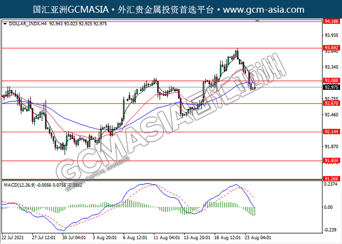 20210824 DOLLAR_INDX-午间 by keyk | Aug 24, 2021 | 美元指数 | 0 comments DOLLAR_INDX,H4:美指突破前期支撑,空头排列。MACD动能略减,短期可继续看空为主。上方关注93.10压力和93.70压力,下方关注92.65支撑和92.15支撑。