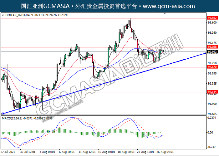 20210827 DOLLAR_INDX-午间 by keyk | Aug 27, 2021 | 美元指数 | 0 comments DOLLAR_INDX,H4:美指震荡上行,目前测试靠近前期压力。MACD形成金叉,动能略增,若突破可继续看多为主。上方关注93.10压力和93.70压力,下方关注92.65支撑和92.15支撑。