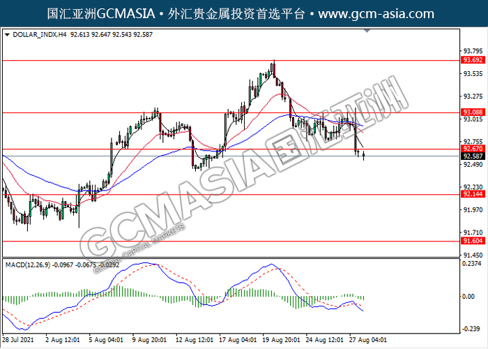 20210830 DOLLAR_INDX-午间 by keyk | Aug 30, 2021 | 美元指数 | 0 comments DOLLAR_INDX,H4:美指突破前期支撑,空头排列。MACD形成死叉,动能略减,短期可继续看空为主。上方关注92.65压力和93.10压力,下方关注92.15支撑和91.60支撑。