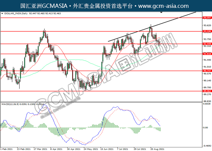 20210902 DOLLAR_INDX by willy | Sep 2, 2021 | 美元指数 | 0 comments DOLLAR_INDX,Daily:美指震荡下行,目前靠近前期支撑。MACD空头动能略增,若下破可关注空头为主。上方关93.25力和94.10压力,下方关注92.45支撑和91.80支撑。