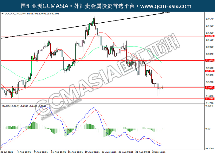 20210906 DOLLAR_INDX by willy | Sep 6, 2021 | 美元指数 | 0 comments DOLLAR_INDX,H4:美指震荡下行。然而,MACD空头动能略减,短期可关注技术性回调为主。上方关92.45力和92.70压力,下方关注92.05支撑和91.80支撑。