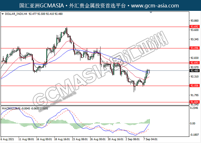 DOLLAR_INDX,H4:美指触底反弹上行。MACD动能略增,短期可继续看多为主。上方关注92.70压力和93.10压力,下方关注92.05支撑和91.60支撑。