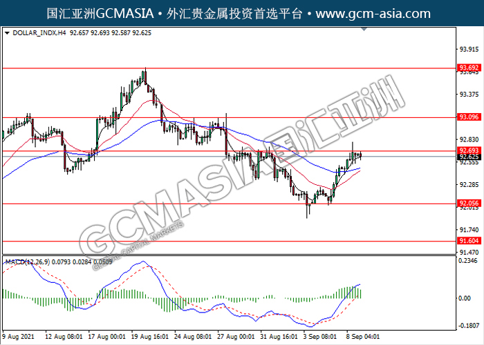 DOLLAR_INDX,H4:美指震荡上行,目前测试前期压力。然而,MACD多头动能略减,短期关注技术性空头回调为主。上方关注92.70压力和93.10压力,下方关注92.05支撑和91.60支撑。