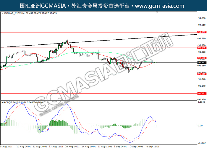 20210910 DOLLAR_INDX by willy | Sep 10, 2021 | 美元指数 | 0 comments DOLLAR_INDX,Daily:美指震荡上行,目前测试前期压力。然而,MACD空头动能略增,短期可关注技术性回调为主。上方关92.70力和93.25压力,下方关注91.80支撑和90.75支撑。