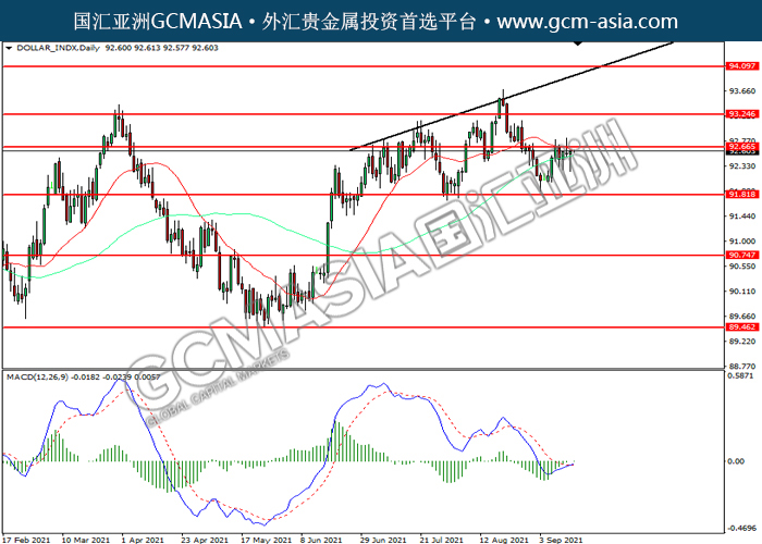20210915 DOLLAR_INDX by willy | Sep 15, 2021 | 美元指数 | 0 comments DOLLAR_INDX,Daily:美指震荡上行,目前测试前期压力。MACD多头动能略增,若突破可关注多头为主。上方关92.70力和93.25压力,下方关注91.80支撑和90.75支撑。