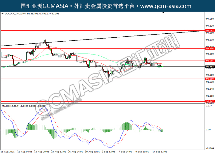 20210916 DOLLAR_INDX by willy | Sep 16, 2021 | 美元指数 | 0 comments DOLLAR_INDX,Daily:美指震荡上行,目前测试前期压力。然而,MACD空头动能略增,短期可关注技术性回调为主。上方关92.70力和93.25压力,下方关注91.80支撑和90.75支撑。
