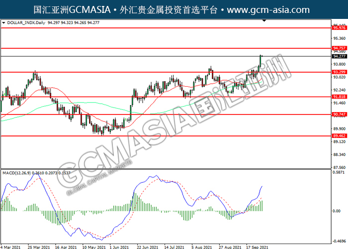 20210930 DOLLAR_INDX by keyk | Sep 30, 2021 | 美元指数 | 0 comments DOLLAR_INDX,Daily:美指震荡上行。MACD多头动能略增,短期可关注多头为主。上方关94.75压力和95.95压力,下方关注93.30支撑和91.80支撑。
