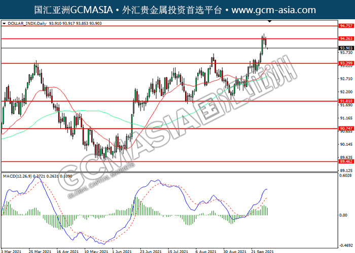 20211004 DOLLAR_INDX by keyk | Oct 4, 2021 | 美元指数 | 0 comments DOLLAR_INDX,Daily:美指高位回落。MACD多头动能略减,短期可关注空头为主。上方关94.25压力和94.75压力,下方关注93.30支撑和91.80支撑。