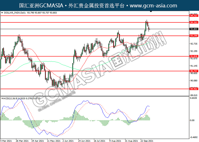 20211005 DOLLAR_INDX by keyk | Oct 5, 2021 | 美元指数 | 0 comments DOLLAR_INDX,Daily:美指高位回落。MACD多头动能略减,短期可关注空头为主。上方关94.25压力和94.75压力,下方关注93.30支撑和91.80支撑。