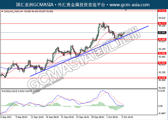 20211006 DOLLAR_INDX-午间 by keyk | Oct 6, 2021 | 美元指数 | 0 comments DOLLAR_INDX,H4:美指触底反弹上行。MACD空头动能略减,短期继续看多反弹为主。上方关94.35压力和94.90压力,下方关注93.70支撑和93.10支撑。