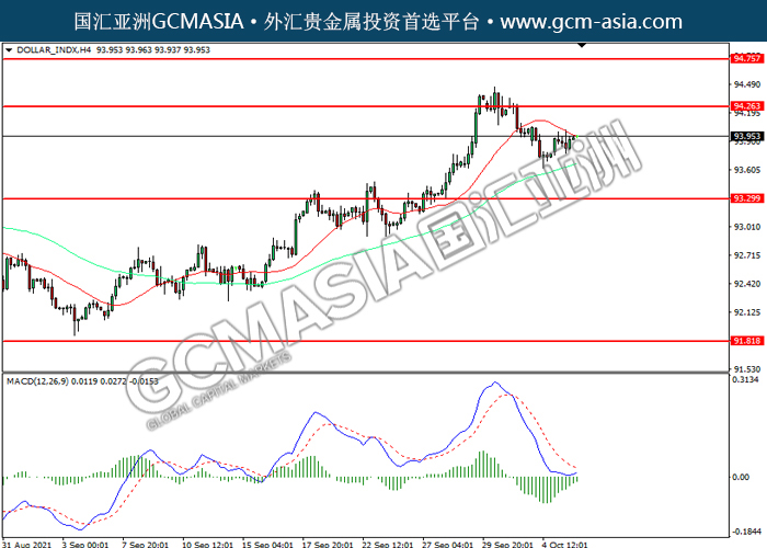 20211006 DOLLAR_INDX by keyk | Oct 6, 2021 | 美元指数 | 0 comments DOLLAR_INDX,H4:美指高位回落。然而,MACD空头动能略减,短期可关注技术性回调为主。上方关94.25压力和94.75压力,下方关注93.30支撑和91.80支撑。