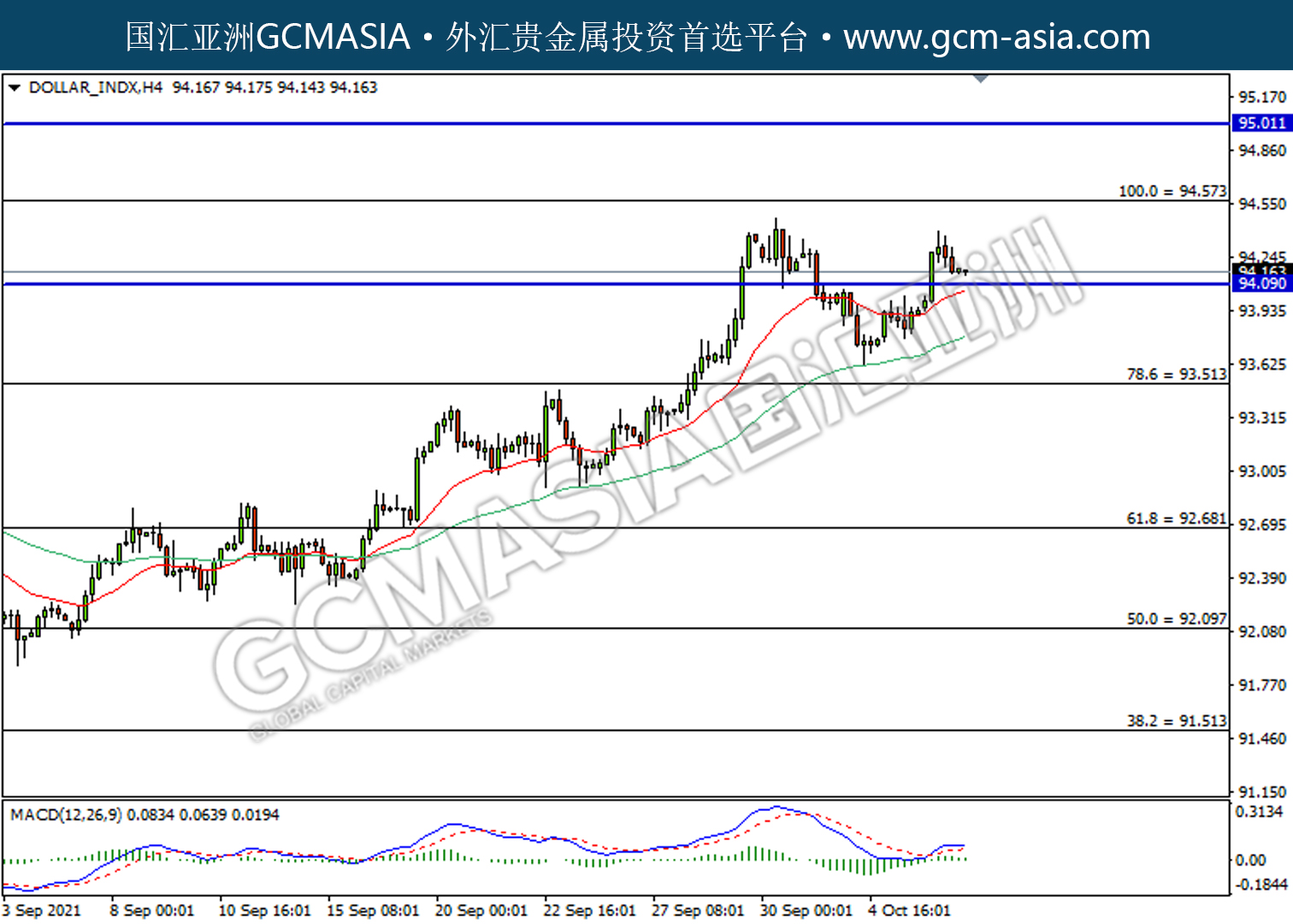 20211007 DOLLAR_INDX by willy | Oct 7, 2021 | 美元指数 | 0 comments DOLLAR_INDX,H4:美指高位承压回落。MACD多头动能有所略减,短期关注空头势力为主。上方关注94.60压力和95.00压力,下方关注94.10支撑和93.50支撑。