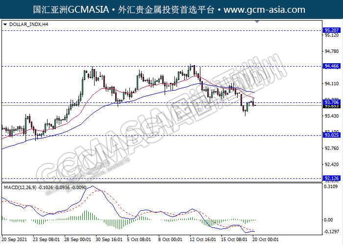 20211020 DOLLAR_INDX-午间 by keyk | Oct 20, 2021 | 美元指数 | 0 comments DOLLAR_INDX,H4:美元近期低位反弹,目前测试前期压力。MACD空头动能略减,若突破可关注多头方向为主。上方关93.70压力和94.45压力,下方关注93.00支撑和92.10支撑。