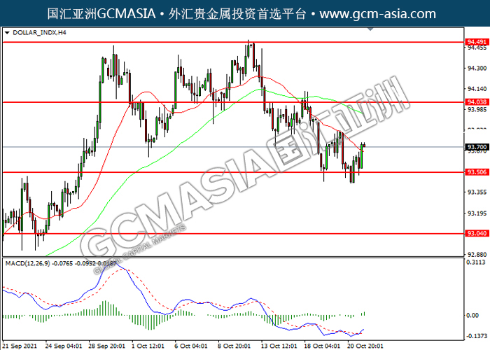20211022 DOLLAR_INDX by willy | Oct 22, 2021 | 美元指数 | 0 comments DOLLAR_INDX,H4:美指低位反弹。MACD已形成金叉,动能转强,短期可关注多头为主。上方关94.05压力和94.50压力,下方关注93.50支撑和93.05支撑。