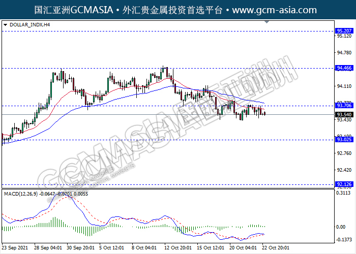 20211025 DOLLAR_INDX-午间 by keyk | Oct 25, 2021 | 美元指数 | 0 comments DOLLAR_INDX,H4:美元高位承压回落。MACD多头动能略减,短期继续看空方向为主。上方关93.70压力和94.45压力,下方关注93.00支撑和92.10支撑。