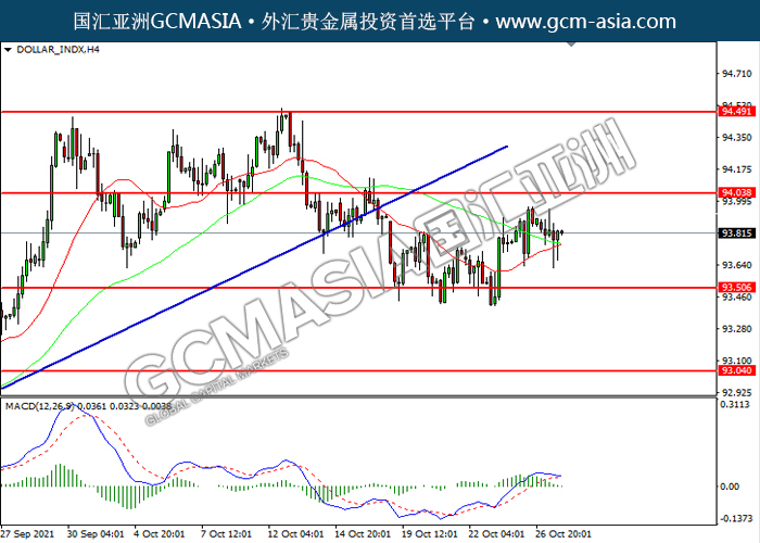 20211028 DOLLAR_INDX by willy | Oct 28, 2021 | 美元指数 | 0 comments DOLLAR_INDX,H4:美指低位反弹。然而,MACD多头动能略减,短期可关注技术性回调为主。上方关94.05压力和94.50压力,下方关注93.50支撑和93.05支撑。