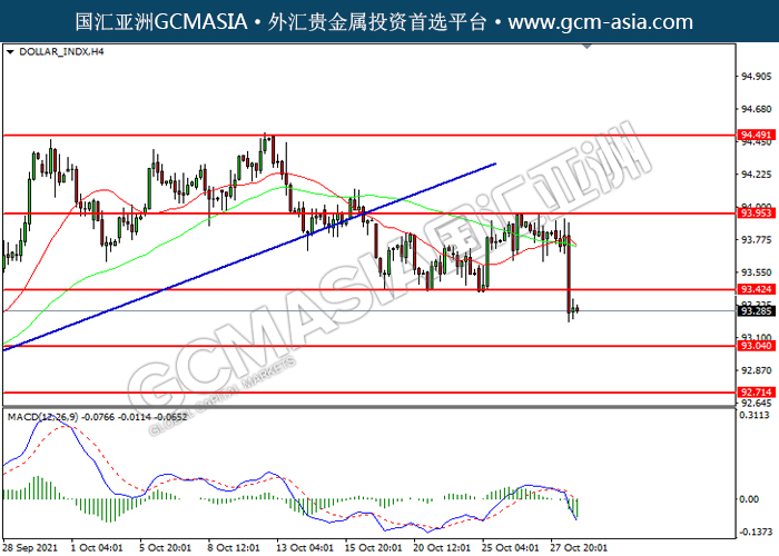 20211029 DOLLAR_INDX by willy | Oct 29, 2021 | 美元指数 | 0 comments DOLLAR_INDX,H4:美指下破前期支撑,持续下行。MACD空头动能略增,短期可关注空头为主。上方关93.40压力和93.95压力,下方关注93.05支撑和92.70支撑。