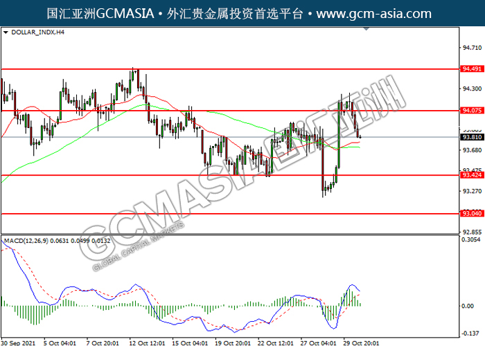 20211102 DOLLAR_INDX by willy | Nov 2, 2021 | 美元指数 | 0 comments DOLLAR_INDX,H4:美指震荡下行。MACD多头动能略减,短期关注空头为主。上方关94.05压力和94.50压力,下方关注93.40支撑和93.05支撑。