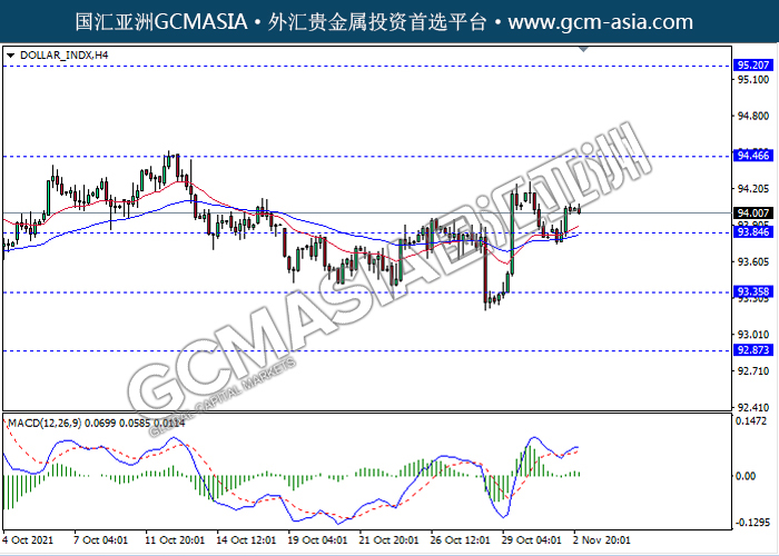 20211103 DOLLAR_INDX-午间 by willy | Nov 3, 2021 | 美元指数 | 0 comments DOLLAR_INDX,H4:美元触底反弹上行。MACD显示多头信号,动能略增,短期继续看多为主。上方关94.45压力和95.20压力,下方关注93.85支撑和93.35支撑。