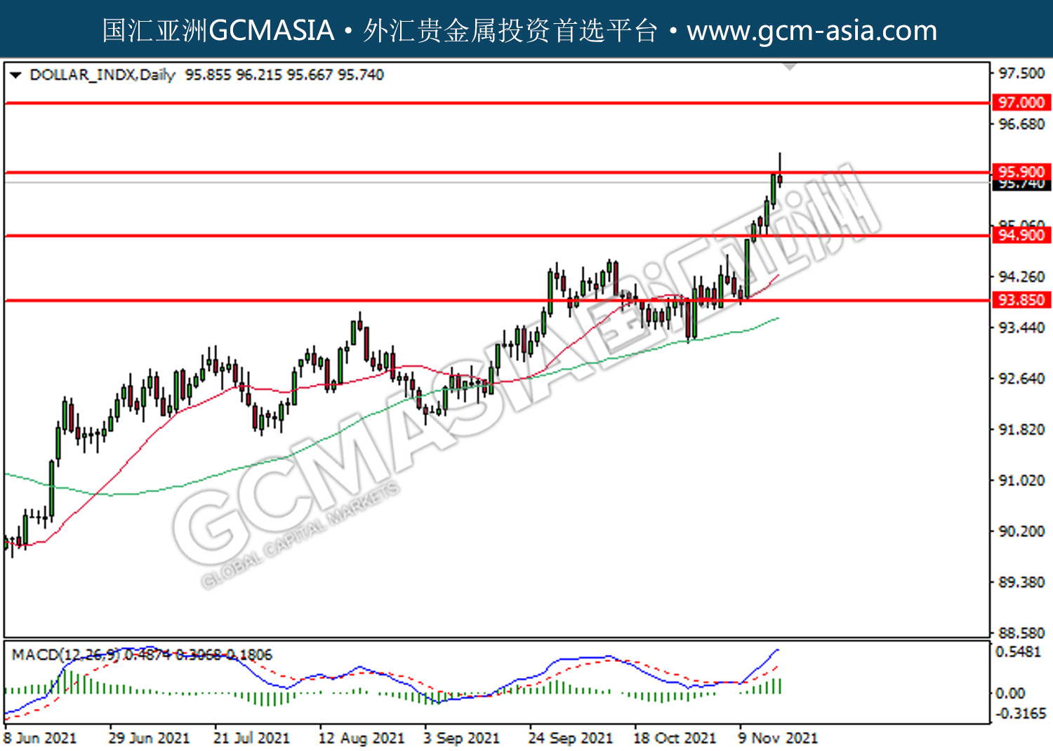 20211118 DOLLAR_INDX by willy | Nov 18, 2021 | 美元指数 | 0 comments DOLLAR_INDX,Daily:美指震荡上行。MACD已形成金叉,动能偏强,若上破可关注多头势力。上方关注95.90压力和97.00压力,下方关注94.90支撑和93.85支撑。