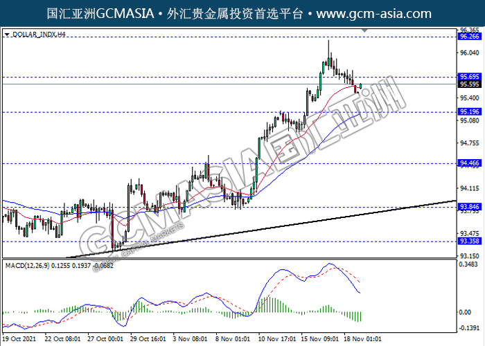 20211119 DOLLAR_INDX-午间 by willy | Nov 19, 2021 | 美元指数 | 0 comments DOLLAR_INDX,H4:美指突破前期支撑,震荡下行。MACD动能持续略减,短期可继续看空方向为主。上方关注95.70压力和96.25压力,下方关注95.20支撑和94.45支撑。